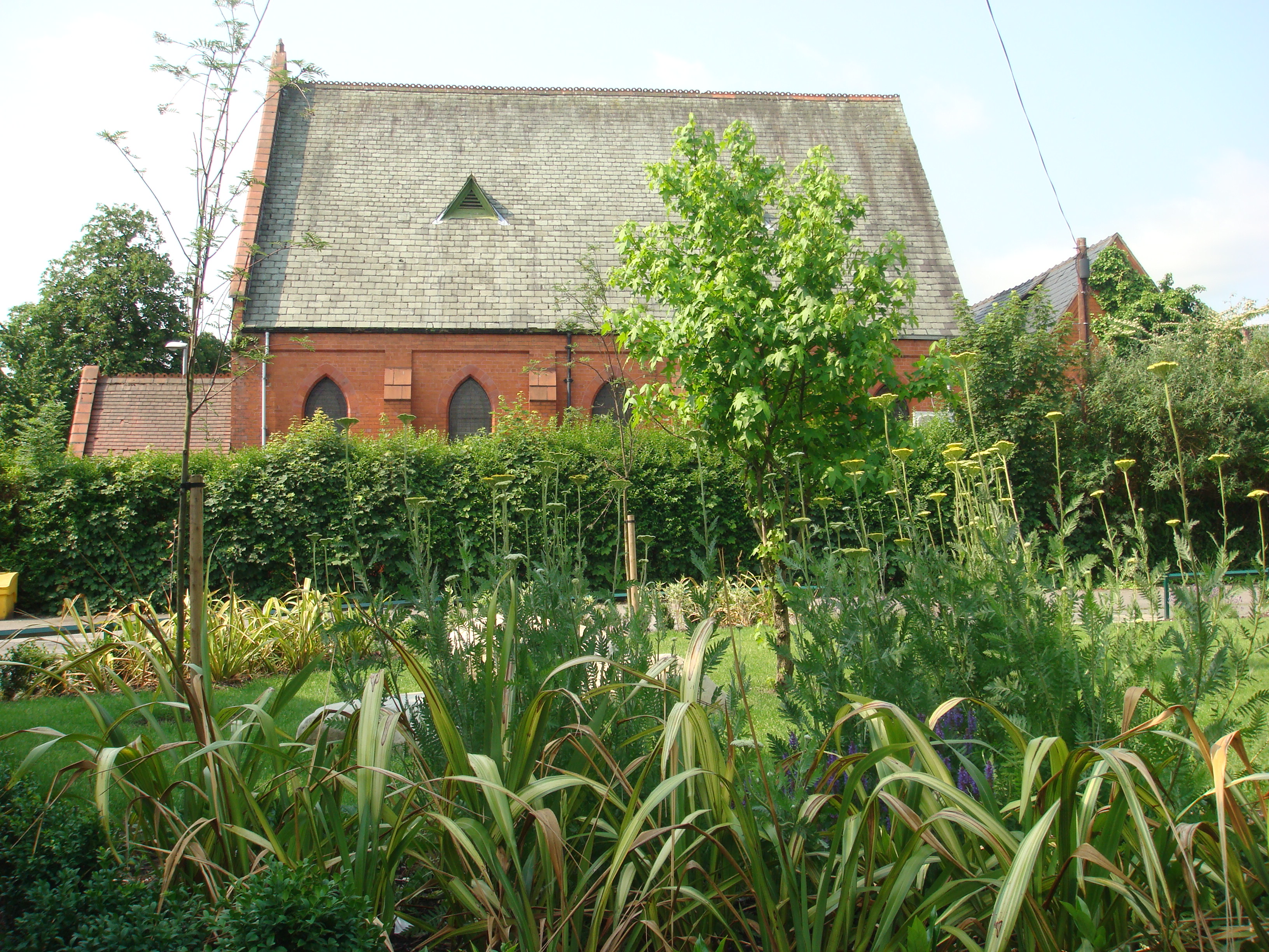 chapel, with recent landscaping and planting in the