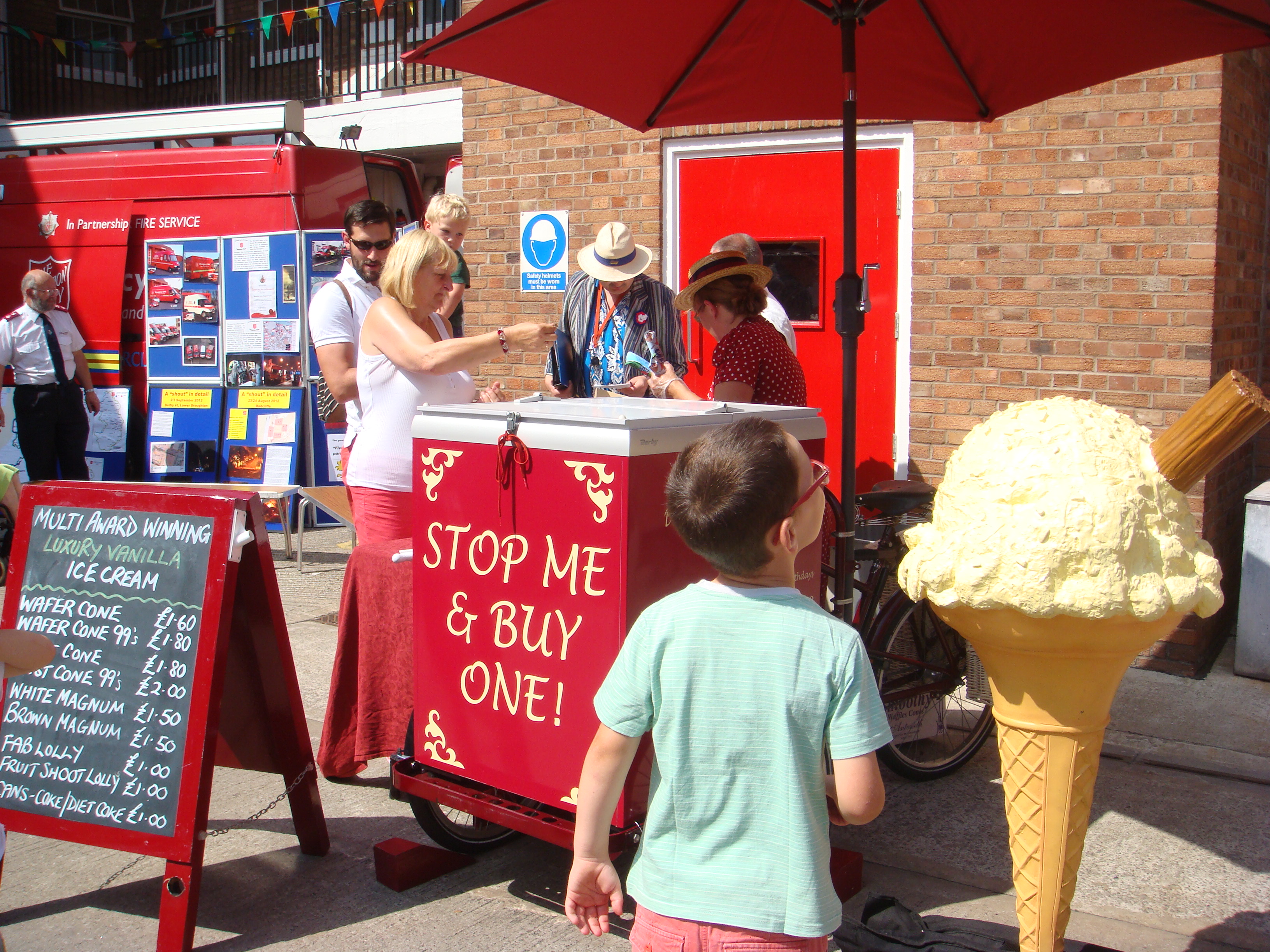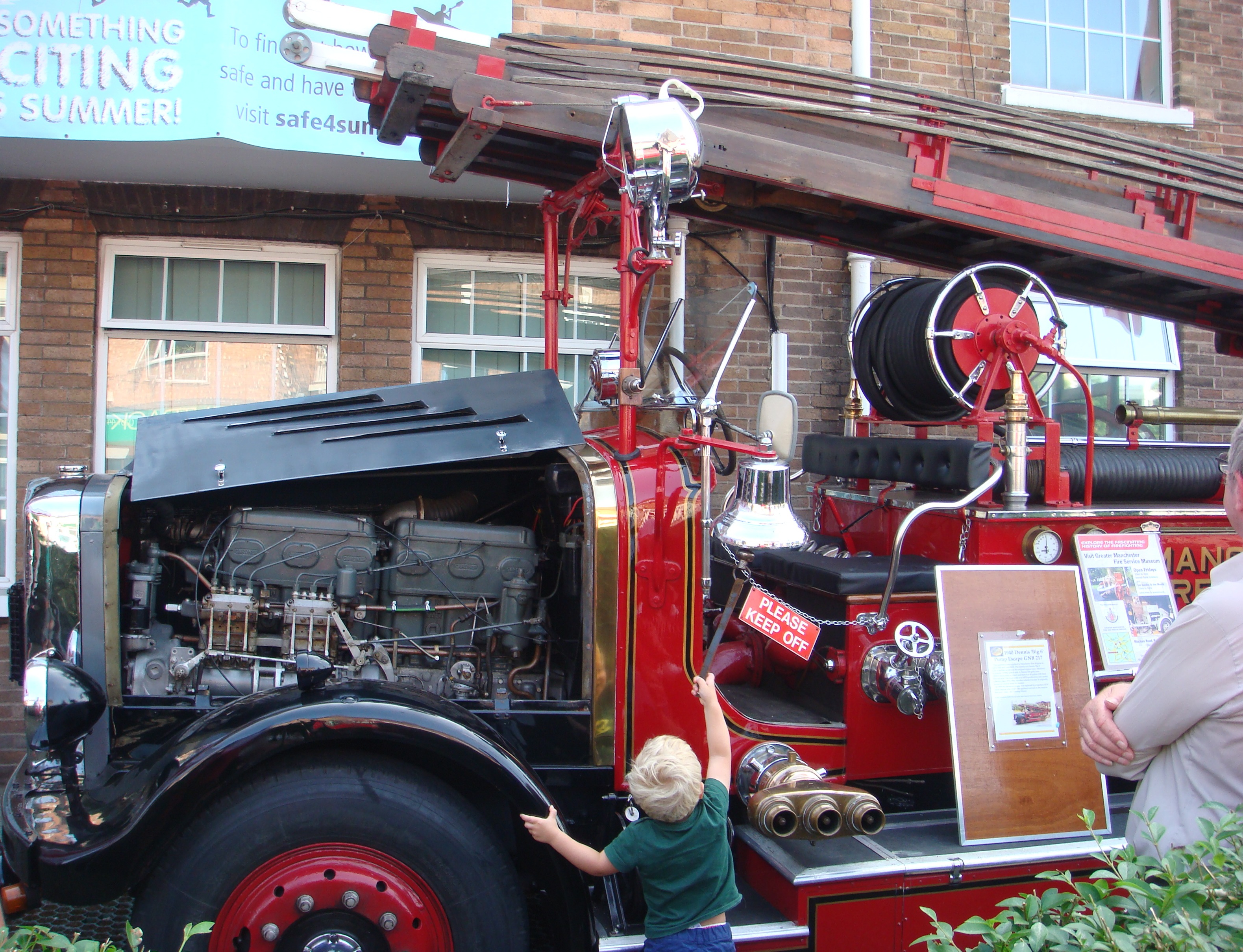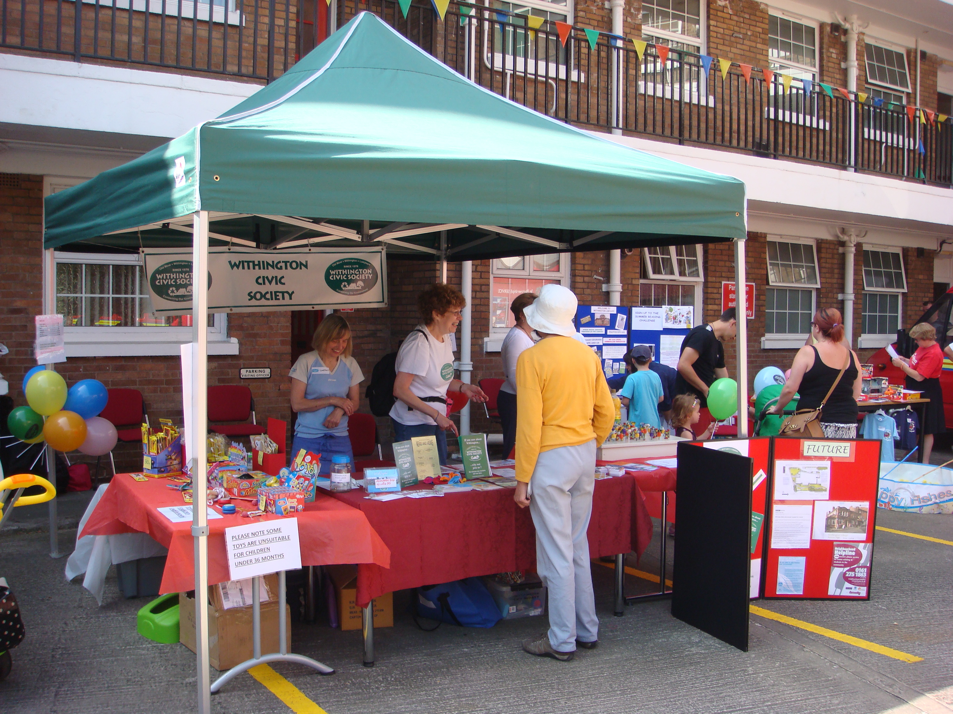A party to celebrate the event was held in gloriously hot summer weather on Saturday, July 13th, running from 10am-4pm. There was much to see, and to buy and consume! The firestation provided two engines and also a vintage fire-engine. There was a vintage ice-cream vendor, fire-dogs (trained to rescue in hostile situations), the unveiling of a new artwork, refreshments, music and stalls, including the Withington Civic Society stall offering 1930s games for children, and a history display of Withington in the 1930s. Thanks to Steve Twinn and his team of firefighters for arranging the celebrations, and to Rita Whitehead and Debbie Hey and all others who helped create and serve at the Civic Society's stall, and to Nicola Clarke for the history display. On